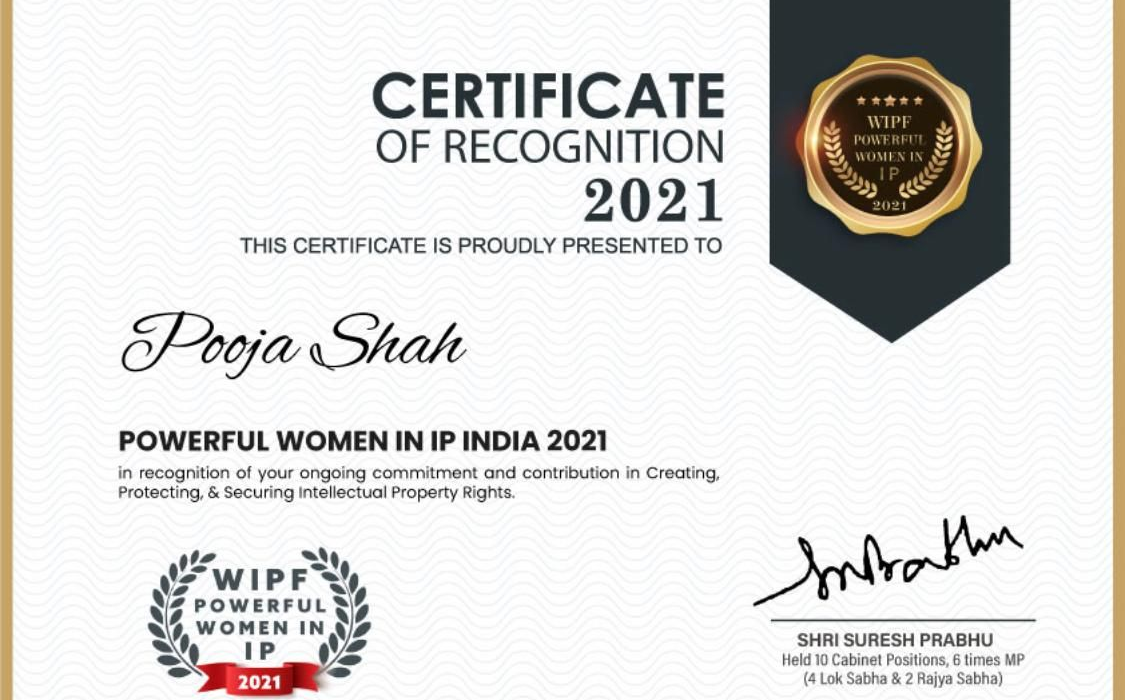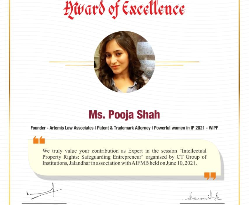 Our founder Pooja Shah was honored for her contribution as an Expert at the session “Intellectual Property Rights: Safeguarding Entrepreneur” organized by CT